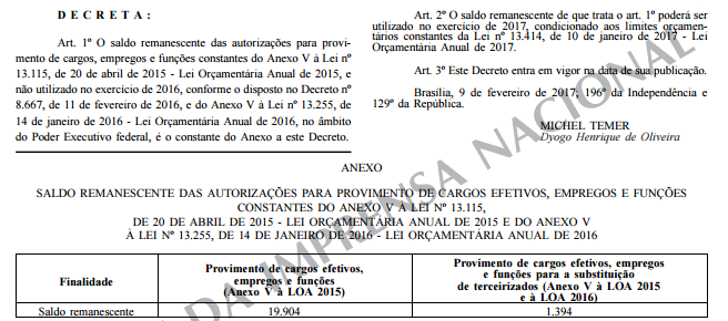 Gente, temos que bater em cima do governo com o Decreto nº 8.986, de 09/02/2017, assinado pelo MICHEL TEMER e o Ministro do Planejamento, Dyogo Henrique de Oliveira, publicado no D.O.U. em 10/02/2017, pois nele consta a permissão de utilização das 19.904 vagas remanescentes da LOA DE 2015, CASO NO QUAL O INSS SE ENCAIXA, JÁ QUE O CONCURSO FOI AUTORIZADO PELA LOA EM TELA.